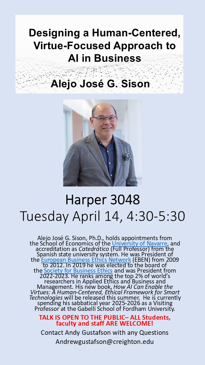 The Business, Faith and Common Good Institute is very pleased to host Alejo Sison, former president of the Society for Business Ethics as well as former President of the European Business Ethics Network (EBEN) to provide a talk on a human-centered approach to AI in business. The talk will be April 14th 430-530 in Harper 3048. All are welcome!!