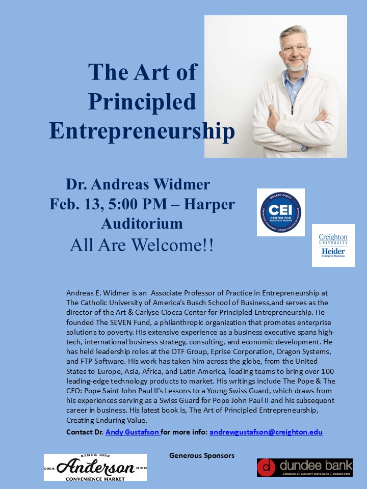 Andreas Widmer, from Catholic University, will be engage with Creighton’s own Alexei Marcoux this coming Thursday February 13th in the Auditorium at the Heider College of Business in the Harper Center at 5pm. All are welcome!