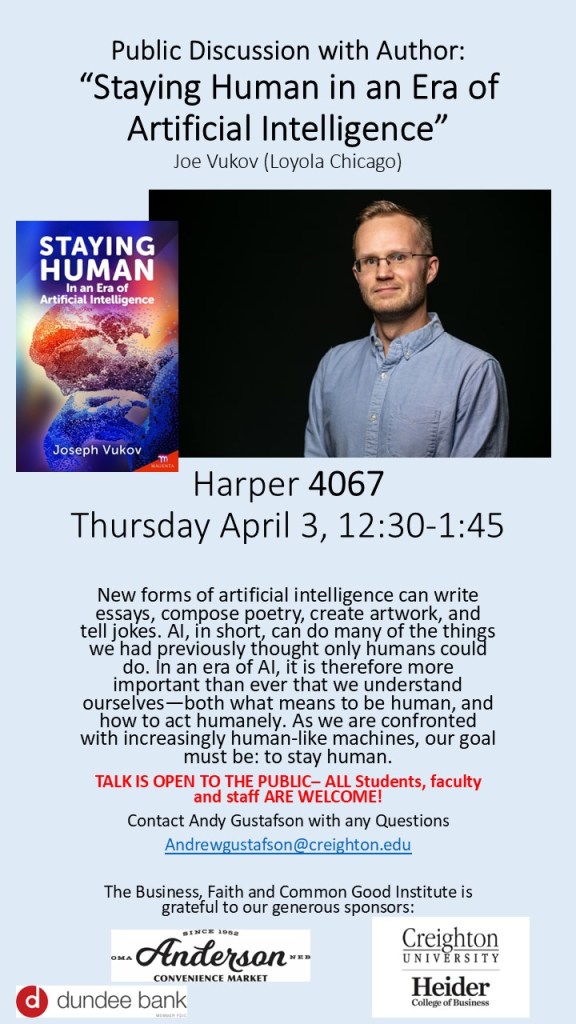 Of course our speaker series which included Andreas Widmer (Catholic University), Joe Vukov (Loyola Chicago), Alex Salter (Texas Tech) and Zach McDonald (Omaha Entrepreneur) provided wonderful public forum opportunities for students, faculty and the larger community to learn and discuss contemporary issues regarding business, faith and society.