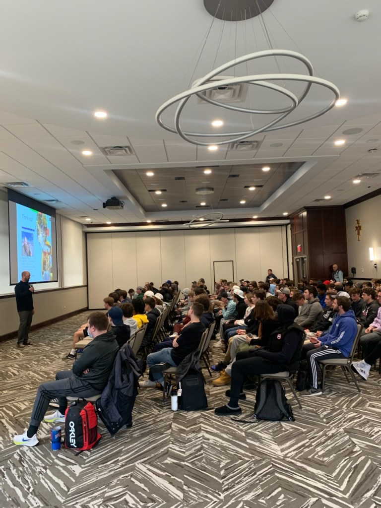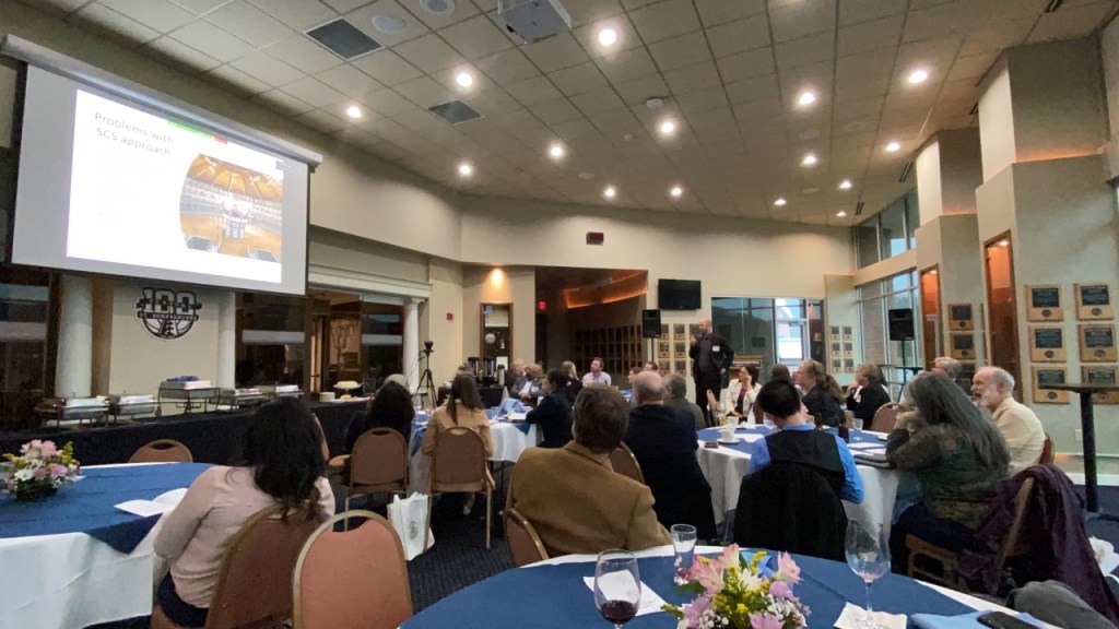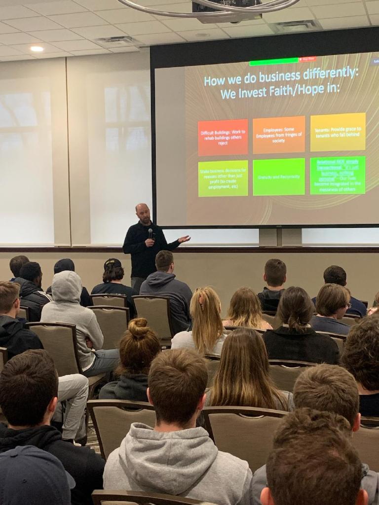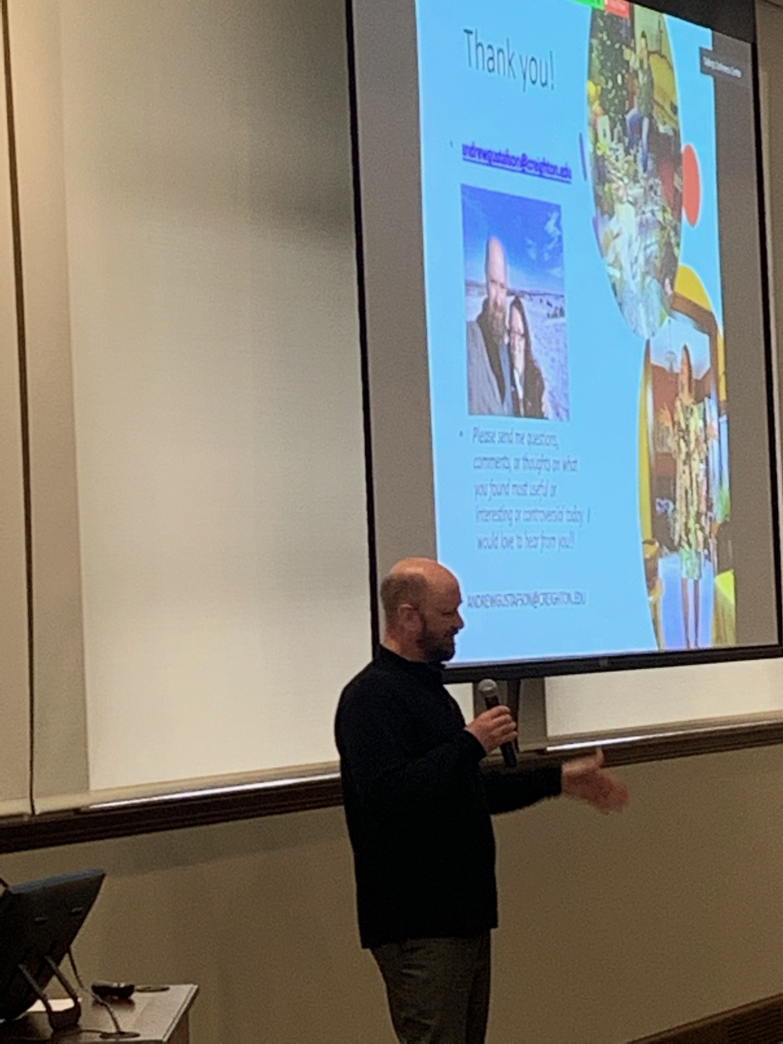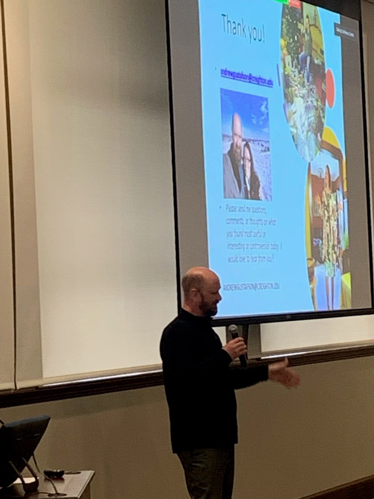 BFCGI director Andy Gustafson gave the opening talk on Friday night entitled ““Authentic Human Leadership and the Common Good (in an Age of AI, Zoom Meetings, and Virtual Society)”. He challenged the professors and administrators there to work to help re-establish strong community at their institutions very intentionally in the face of some of the bad habits many of us have probably fallen into during covid. He also challenged people to help students consider how to use social media, AI and big data for the common good and glory of God (AMDG). Gustafson also had opportunity to speak to about 300 students and faculty on Thursday, sharing how he tries to do good while making a profit with his property restoration and rental business in Omaha.