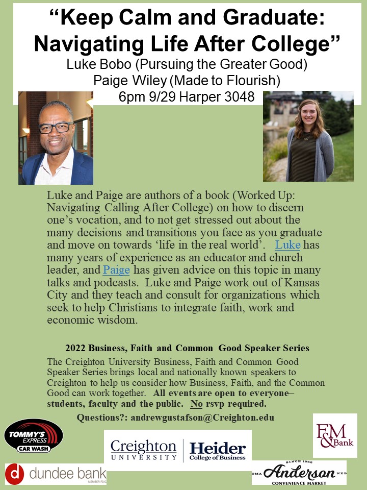 All talks are open to the public. All are in the Harper Center on Creighton’s Campus. Most are 6-7 pm. If you have any concerns or questions, please contact Andy Gustafson at andrewgustafson@creighton.edu