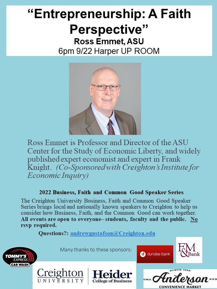 9/22 Ross Emmet (ASU) “Entrepreneurship: A Faith Perspective” (6-7pm, UP Room)