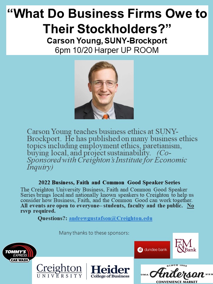This week Carson Young will come to Creighton to present on the topic of what business firms owe their stockholders. It should be a thoughtful and provocative talk. All are welcome!