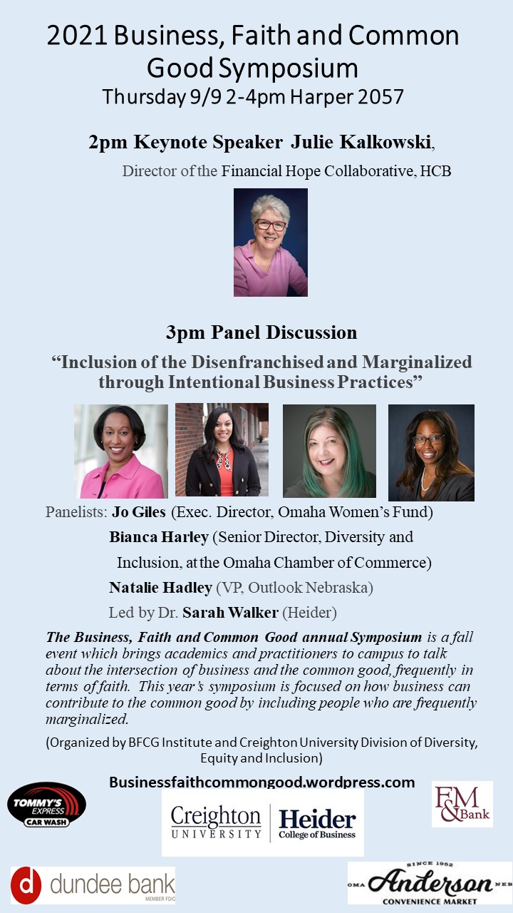 The Business, Faith and the Common Good Symposium is an annual fall event which brings academics and practitioners to Creighton’s campus to speak about how faith impacts their business, how business contributes to the common good, or whose vision of the common good is inspired by faith (or all three). It is open to the public and all of the Creighton Community as part of the celebration of mission week!