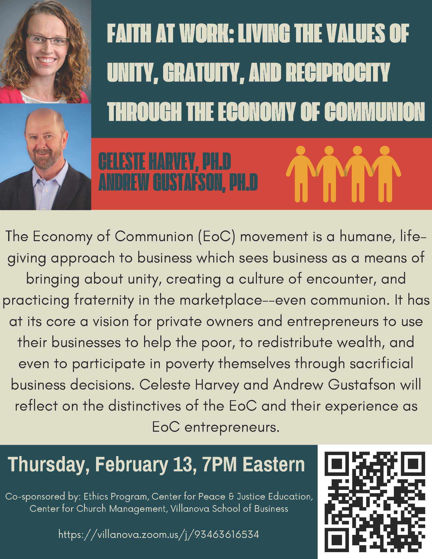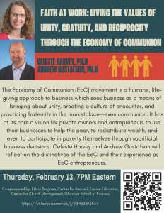 Harvey and Gustafson co-presented a zoom lecture “Faith at Work: living the values of unity, gratuity and reciprocity through the Economy of Communion” (zoom talk) to Villanova University, 2/13/2025